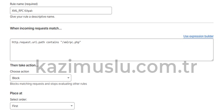 Yukardaki gibi Create Rules > Custom Rules dedikten sonra açılan ekranda Builder’i edit yaparak bu kodu yapıştırabilirsiniz. Bir Rule Name verin, Aksiyon olarak Managed Challenge, Select order olarakta XMLRPC kuralımızın hemen altında olacak şekilde sıralandırabilirsiniz.